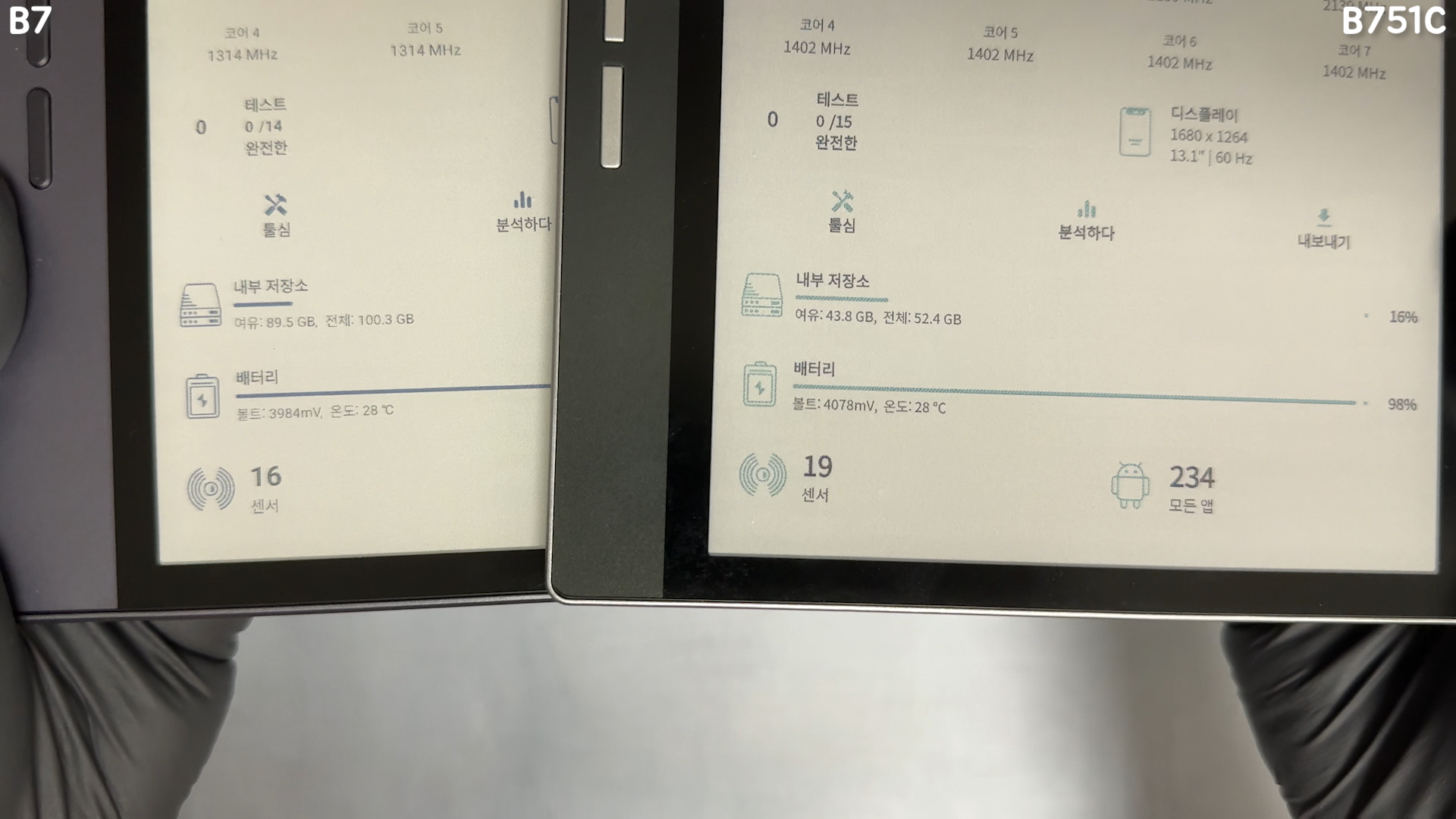 배터리는 B7 3000mAh이고, B751C 2300mAh입니다. 전작 대비 램과 저장공간, 배터리 모두 대폭 업그레이드 되었습니다. 단순 독서 시 배터리는 오래가지만, 4G 셀룰러를 사용하게 되면 배터리 소모 속도는 빨라질 수 있습니다. B7은 16개 센서를 탑재하고, B751C는 19개 센서를 탑재했습니다. 두 제품 모두 자동 화면 회전 기능을 제공하고 있습니다.